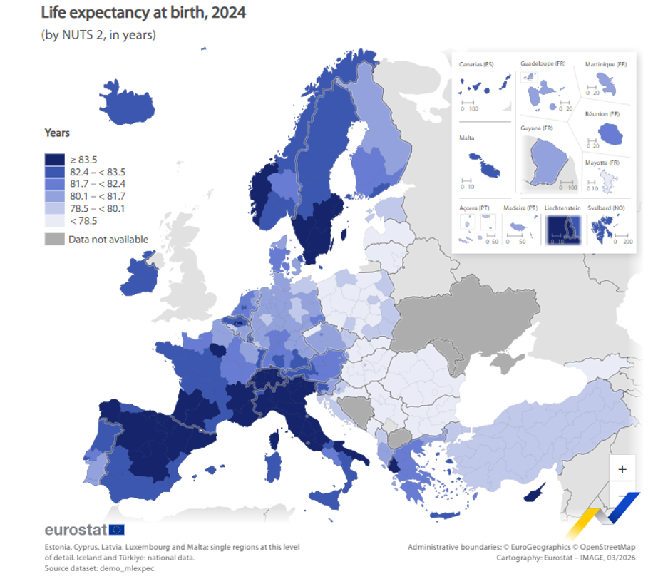 A livello Ue, queste sono le cinque Regioni dove si registra la più bassa aspettativa di vita alla nascita: tre si trovano in Bulgaria (Severozapaden 73,9 anni, Severen tsentralen 74,9 anni e Severoiztochen 75,4 anni), mentre le altre 2 sono Mayotte in Francia (74,5 anni) e Észak-Magyarország in Ungheria (75,1 anni).