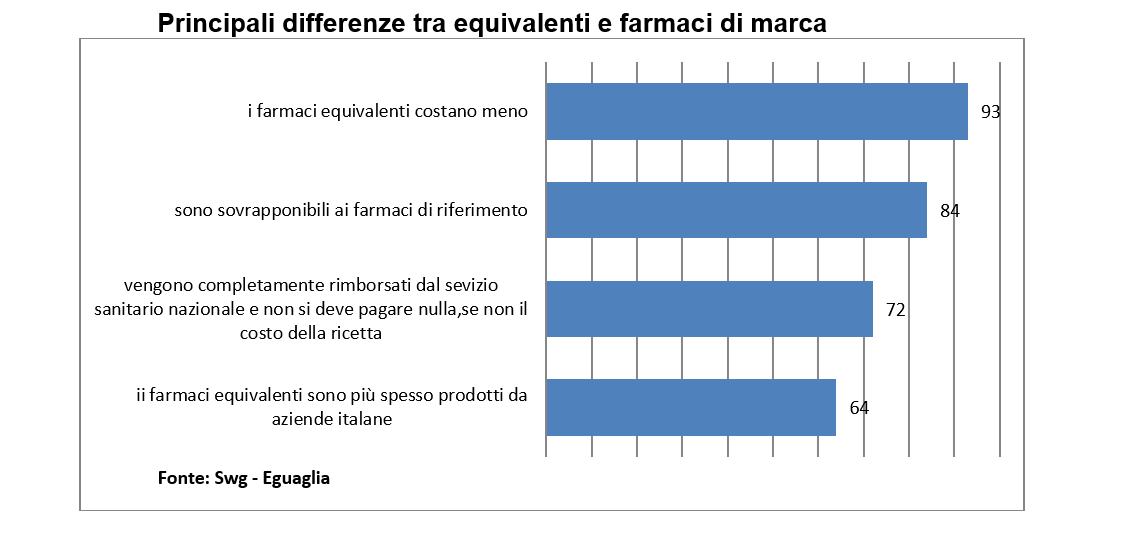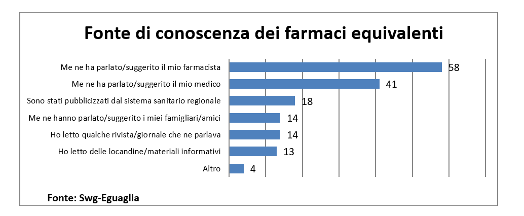 Dalla ricerca Swg su “Osservatorio sulla propensione degli italiani ad acquistare e utilizzare farmaci equivalenti” risulta che quasi 3 italiani su 4 dichiarano di conoscere bene questa tipologia di farmaci, in particolare gli anziani, cioè i grandi consumatori di medicinali. Sono conoscenze che derivano da diverse fonti di informazioni: le principali sono i farmacisti, come confermano 6 intervistati su 10, mentre la seconda è il medico: lo dichiarano 4 individui su 10. Meno efficaci le altre fonti, come il Sistema sanitario regionale e i giornali, come pure in famiglia o tra amici se ne parla, ma solo per il 14%.