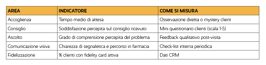 Nella tabella che riportiamo qui sotto, un esempio operativo di come una farmacia può iniziare a misurarsi.