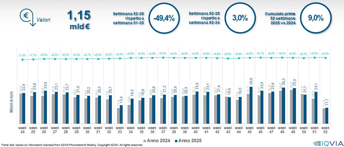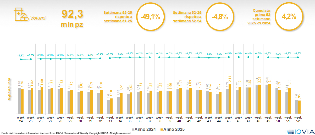 - Farmaci Otc-Sop: nel 2025 prestazioni di tutto rilievo per il comparto, che chiude i 12 mesi con un fatturato in crescita di quali il 17% e volumi anch’essi in positivo (+13,5%). A spingere, nelle ultime settimane di dicembre, è stata ovviamente la stagionalità, che la fine dell’anno è coincisa con il picco influenzale.
