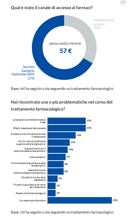 Tuttavia, se l’accessibilità è maggiore, le difficoltà emergono altrove. Le problematiche segnalate da chi ha intrapreso una terapia farmacologica, infatti, non riguardano tanto il costo, quanto la gestione della cura stessa: durata eccessiva, effetti collaterali, scarsa motivazione o mancanza di supporto da parte dei famigliari.