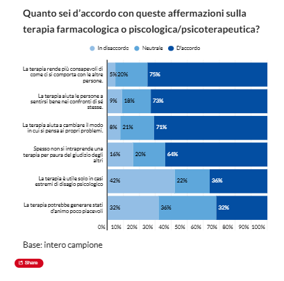 A confermare questa tendenza è anche il parere espresso dagli intervistati in merito a una serie di affermazioni relative alla terapia psicologica e farmacologica: un segnale incoraggiante che lascia intravedere un possibile cambio di passo culturale.